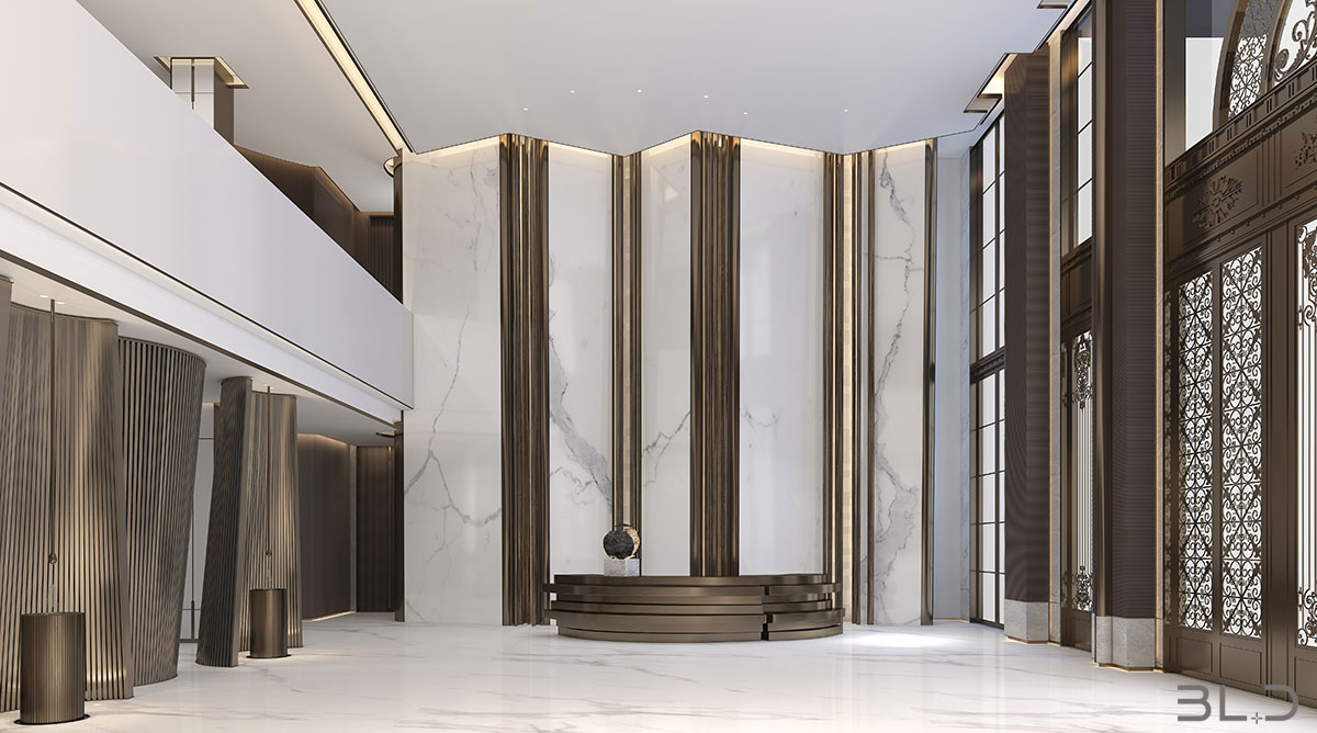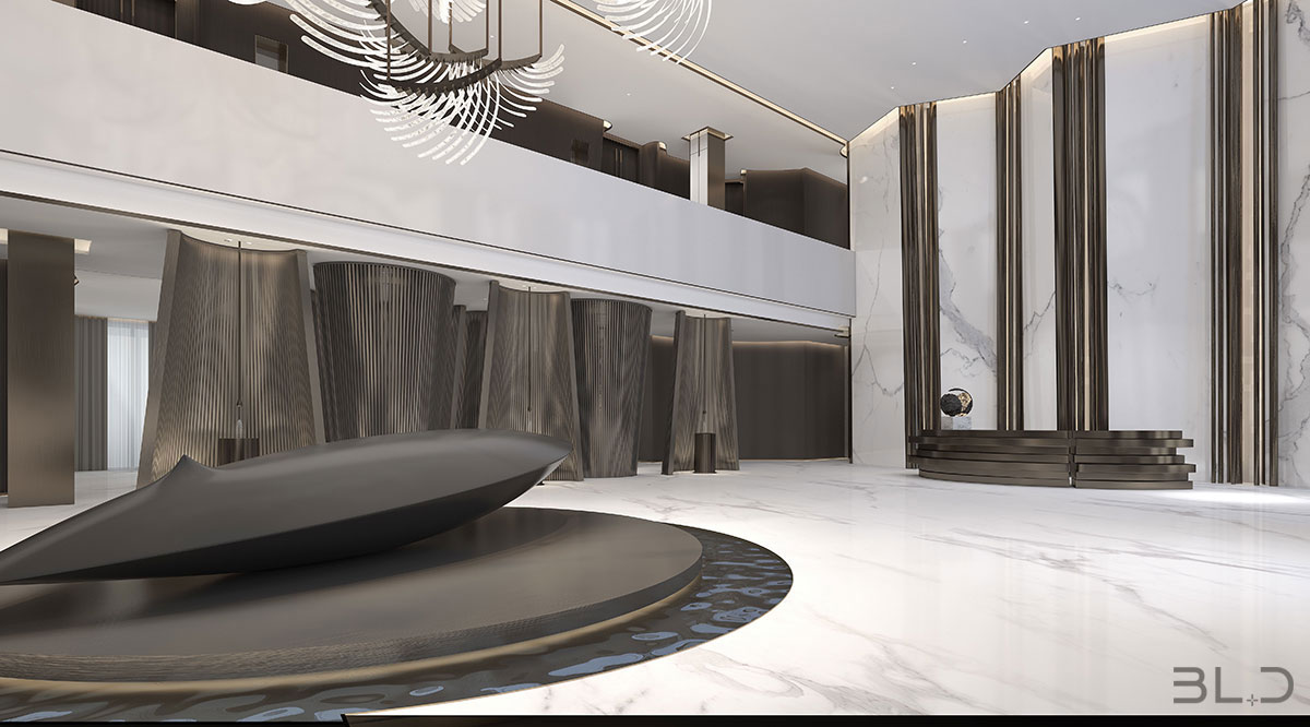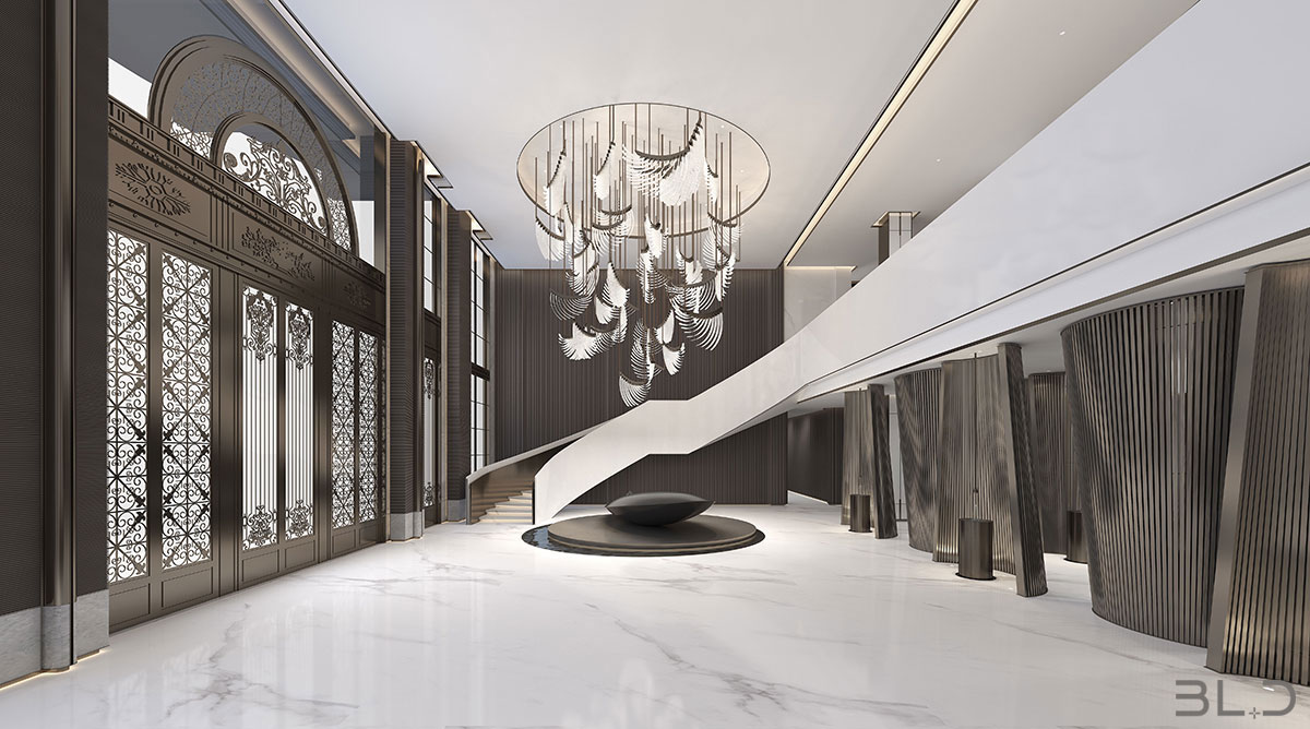 大堂以大尺度挑高設(shè)計(jì),加上有序交互的幾何形體與線條,讓空間極具延展性。九尊水滴藝術(shù)裝置成為大廳另一點(diǎn)睛之筆,設(shè)計(jì)師伽馬取意“九眼水滴,禪心觀上”。從空中飛泄而下的藝術(shù)燈飾,構(gòu)思于蘇州非遺文化“折扇”。晶 瑩透亮似羽似扇的造型,表達(dá)輕盈與厚重,質(zhì)樸與力量。